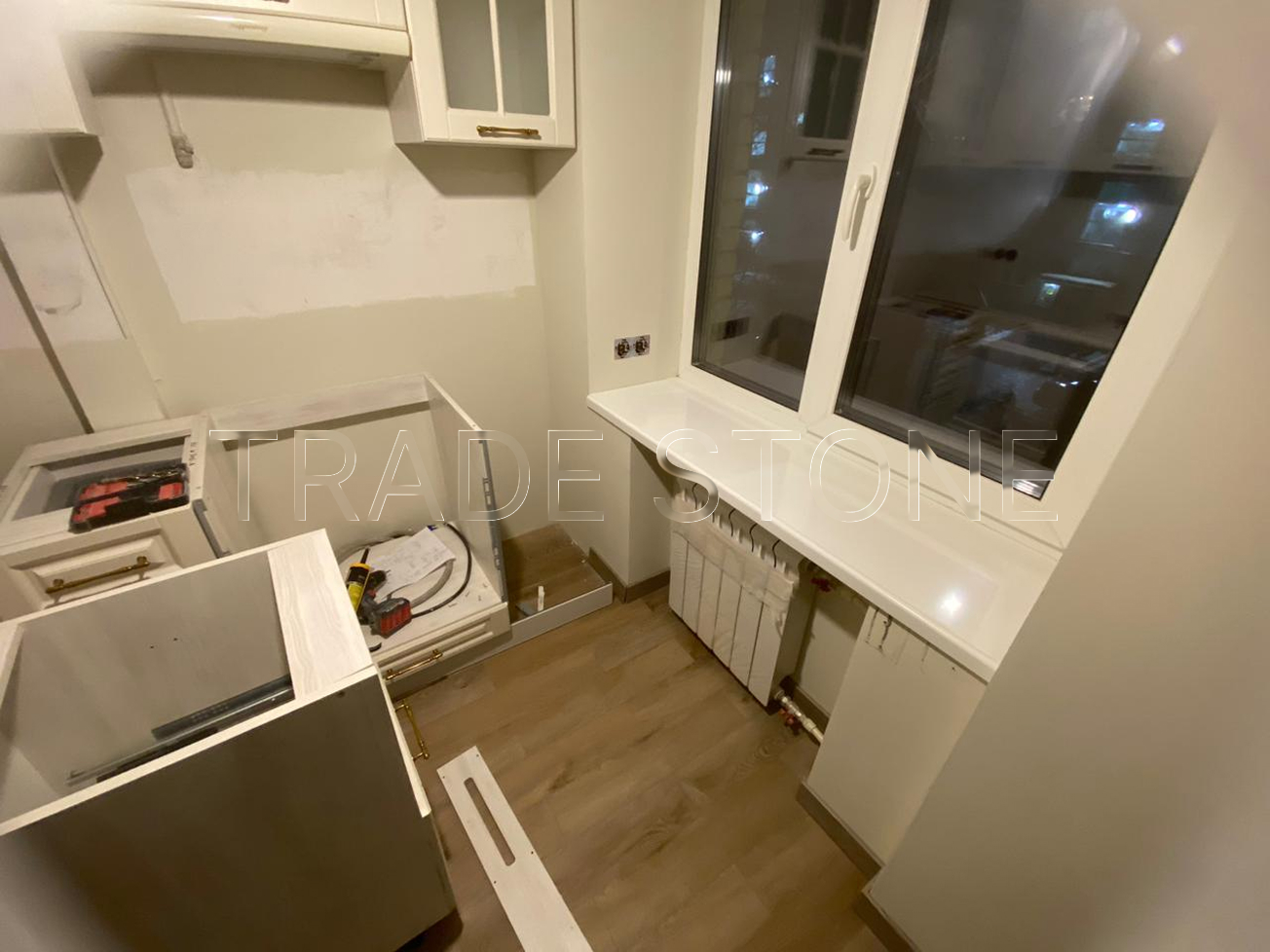 Подоконник из искусственного камня в светлом оттенке по индивидуальным размерам. Аккуратная интеграция в оконный проём, плотное примыкание к стенам и устойчивость к влаге и перепадам температуры.