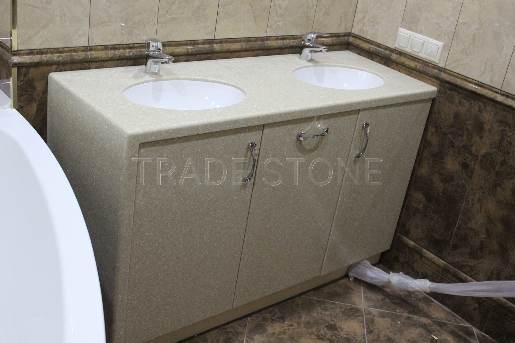 Прямая столешница для ванной комнаты с двумя овальными интегрированными раковинами. Выполнена из бежевого искусственного камня с крапчатой текстурой, имитирующей натуральный материал. Конструкция включает три вместительных шкафчика с хромированными ручками, обеспечивающими удобное хранение банных принадлежностей. Смесители расположены над каждой раковиной, что делает использование столешницы максимально функциональным для двух пользователей одновременно. Плотное примыкание к стене предотвращает протечки и упрощает уборку.
