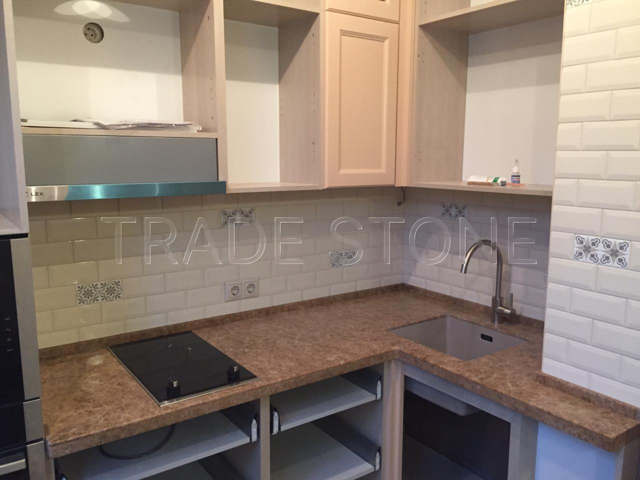 Угловая столешница в тёплых бежево-коричневых тонах с текстурой под мрамор органично вписана в кухонный интерьер. Поверхность объединяет рабочую зону с мойкой из нержавеющей стали и местом для встраиваемой варочной панели. Чистые линии и лаконичный дизайн подчёркивают функциональность пространства. Столешница гармонично сочетается со светлыми фасадами шкафов и белой кафельной облицовкой стены. Практичное решение для компактной кухни.